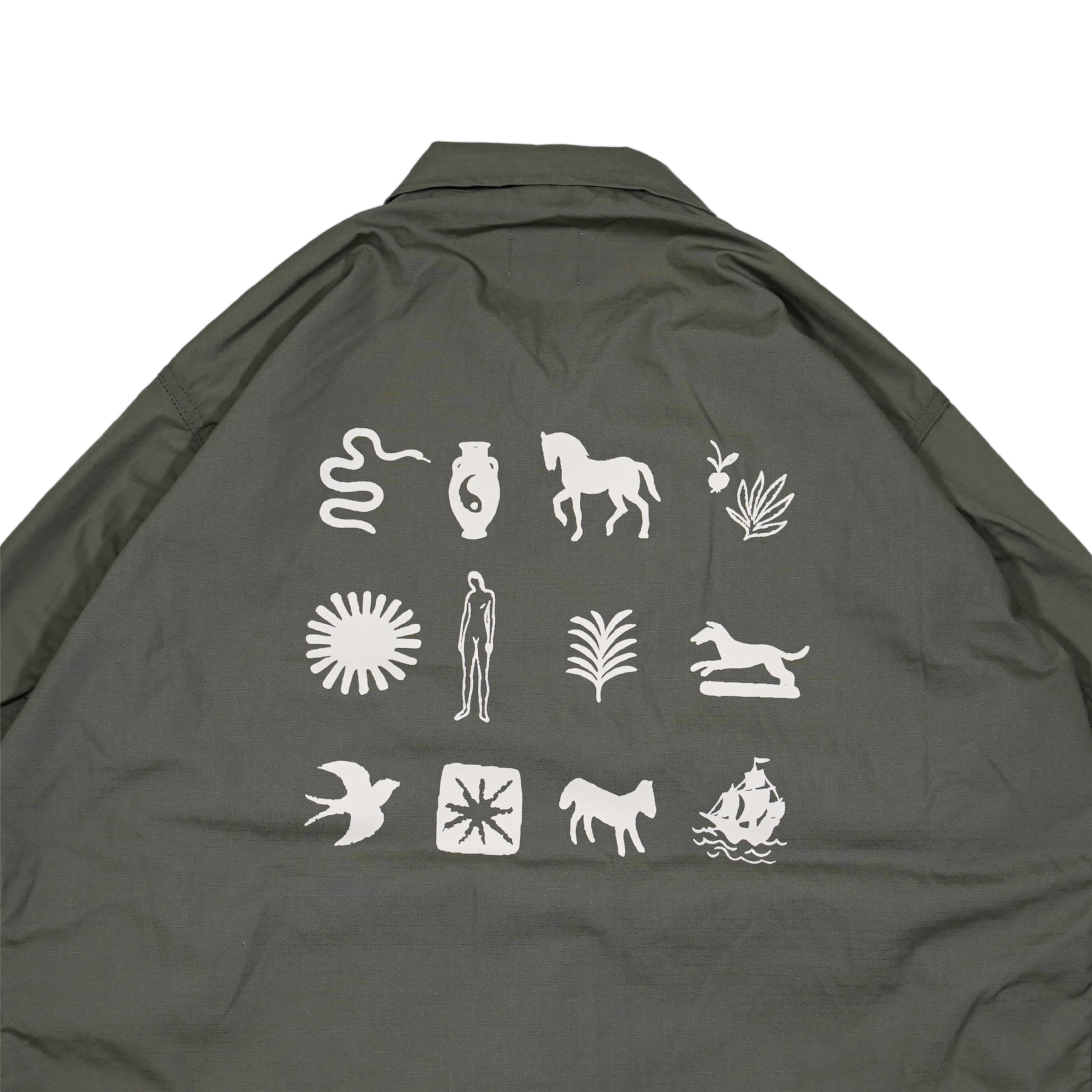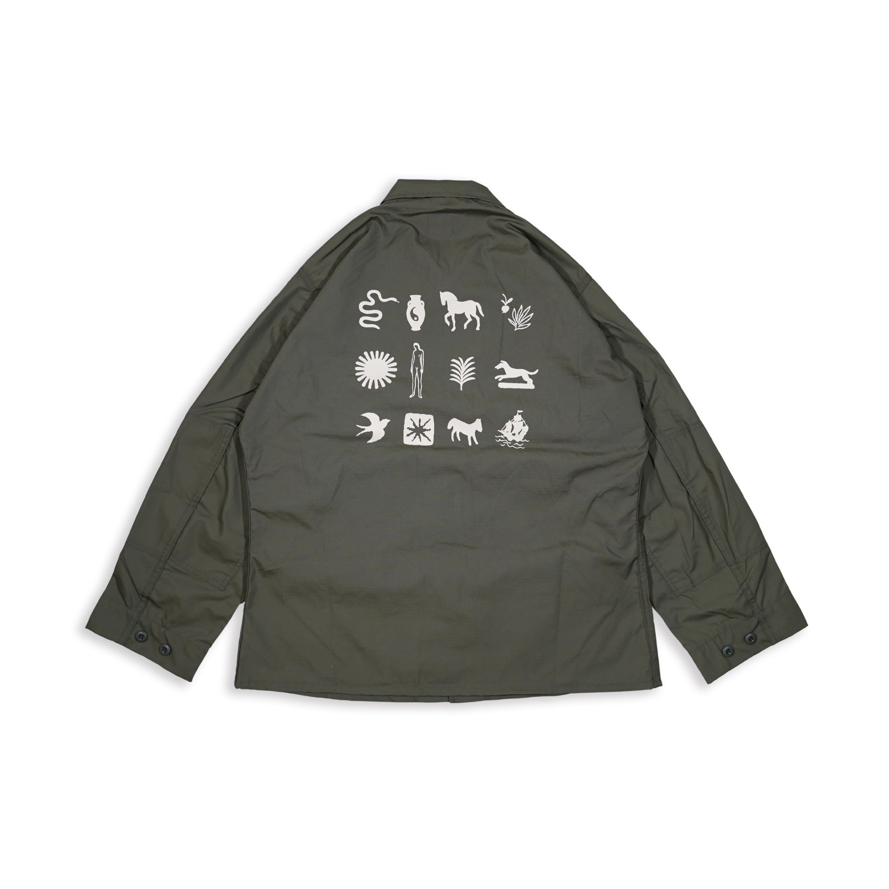 米軍にも納入実績を持つPROPPER社製BDUジャケットをボディに採用したアイテム。優れた耐久性と機能性を備えた本格仕様に、胸の刺繍と背中のアフリカンデザインを融合。リップストップ生地による軽さとタフさを両立し、使い込むほどに味が出る1着です。
